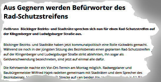 .05.2015 - Die Wogen gingen in berechtigter Weise hoch, denn offensichtlich steigt einigen Leute Amt und Ämtchen in den Kopf, mit dem man lobbymäßig durch die Wand gehen will. Was ist geschehen? Mancher, der an der letzten Böckinger Bezirksbeiratssitzung teilgenommen hatte, fiel aus allen Wolken, was jetzt passiert sein sollte. Einem Bericht auf Stimme-Online vom 19.5.2015 zufolge seien nämlich alle Böckinger Stadt- und Bezirksbeiräte, "während sie noch in der jüngsten Sitzung des Bezirksbeirats einen geplanten Rad-Schutzstreifen auf der Klingenberger und Ludwigsburger Straße strikt ablehnten, ihn sogar als